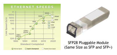 25GigE SFP28接口提供了三個選項,可以滿足所有應用的電纜長度要求。第一種選擇是使用SFP28多模光纖模塊/收發器和LC-LC多模光纖電纜,電纜長度從1M到70M。第二種選擇使用SFP28單模光纖模塊/收發器和LC-LC單模光纖電纜,電纜長度范圍從1M到10KM。第三種選擇是使用低成本直接連接來連接1至5米之間的電纜。相比于CXP連接器,25 GigE的連接器碩大無比。