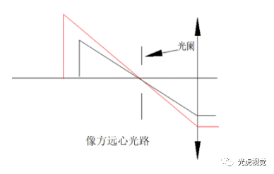 像方遠心光路的光路圖如下圖 。它是將孔徑光闌放置在物方焦平面上,像方主光線平行于光軸主光線的會聚中心位于像方無窮遠。這種鏡頭的特點是放大倍率與像距無關(guān),可以消除像方調(diào)焦不準(zhǔn)引入的測量誤差。