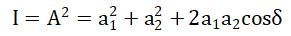 這里,我們用a1和a2分別代表P點處兩束光的振幅大小。此處利用代數相加法計算光強有