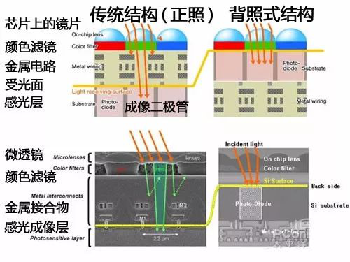 傳統的CMOS “前照式”結構,當光線射入像素,經過了片上透鏡和彩色濾光片后,先通過金屬排線層,最后光線才被光電二極管接收。